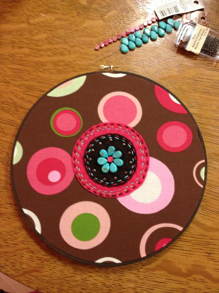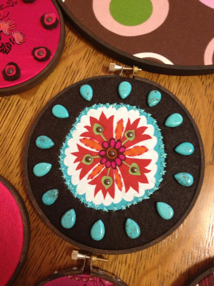 I’m currently living in an apartment with the standard beige colored walls. I have no headboard on my bed because the space is quite small. I decided to take inspiration from this pin and make a “Virtual Headboard” out of the fabric and hoops. Being the detailed oriented person that I am, I also needed to embellish them – plain old fabric just wouldn’t do. I took the color inspiration from my comforter and ran with it from there. I painted the hoops a chocolate brown to match my decor and used fabric, felt, metal brads, ric-rac, ribbon, and beads. Voila! The finished results along with detailed views. It makes me happy every time I walk through the bedroom.