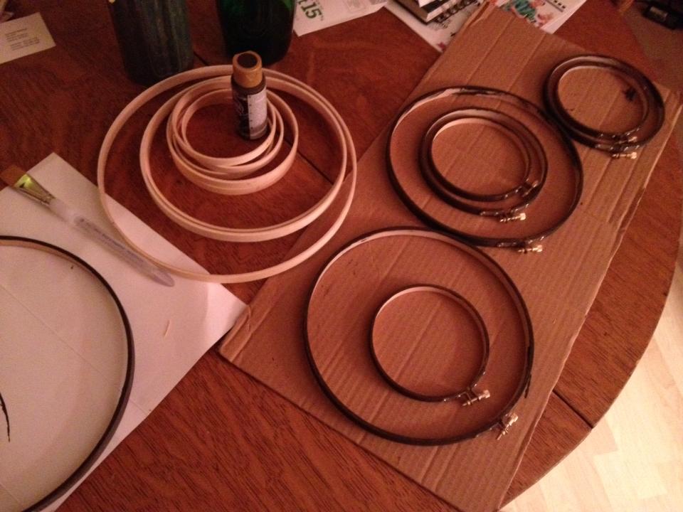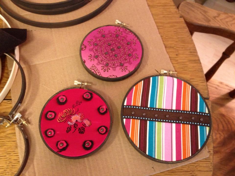 As someone who enjoys scouring magazines and pulling out inspirational things, I am totally addicted to Pinterest. It is my virtual collage of inspiration. I regularly pin things that I’m sure some day I’ll actually make. After several months of pinning, I realized that other than the Good Thoughts Jar, I hadn’t worked on any projects. I woke up last weekend and decided that I was going to start working on projects, not just dream about doing them. My first project was inspired by a pin using wooden embroidery hoops and stretched fabric.