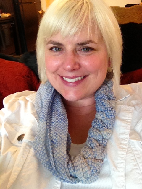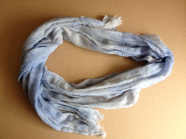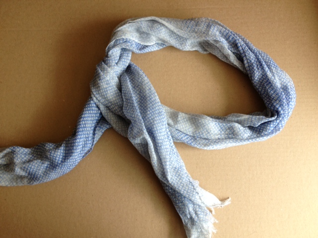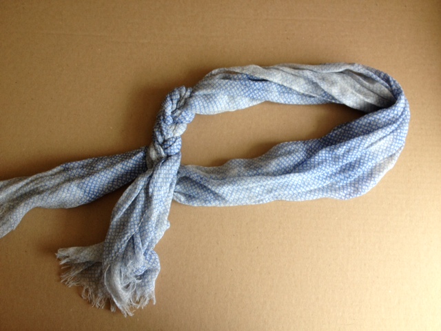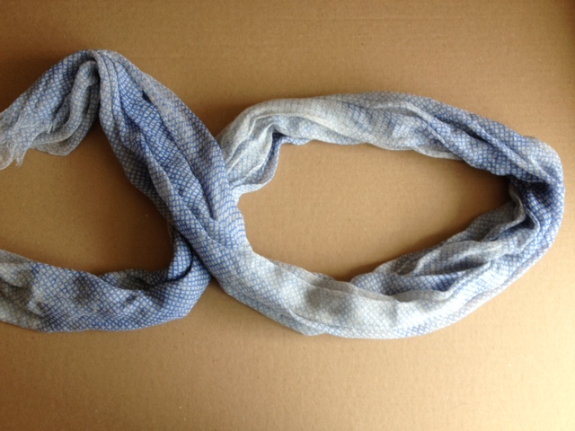 I am really drawn to scarves.  I buy many of them and wear them infrequently.  I find that I never know what to do with the long ends – knotting them can make the scarf seem too bulky and sometimes the ends just get in the way.  I pinned this a few weeks ago and thought I’d give it a try.  I think I found a new way to jazz up those old scarves in my closet.