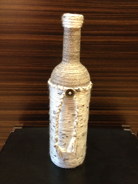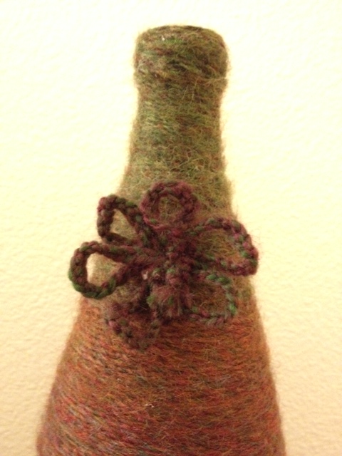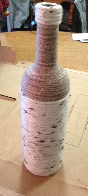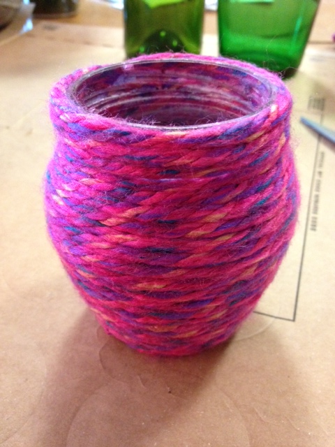 Another Pinterest-inspired project under my belt. I saw these yarn covered bottles and thought they were beautiful. So I thought to myself, “I can make those!”. I picked 3 different glass bottles – a Perrier bottle, a wine bottle, and a glass jam jar. I used Tacky Glue and a foam applicator to spread the glue on each bottle. Then you wind the yarn, being careful to hide your start and stop. The possibilities are endless. **Note to self – next time choose fatter yarn! The smaller the yarn, the longer it takes. But I think the results are worth it.