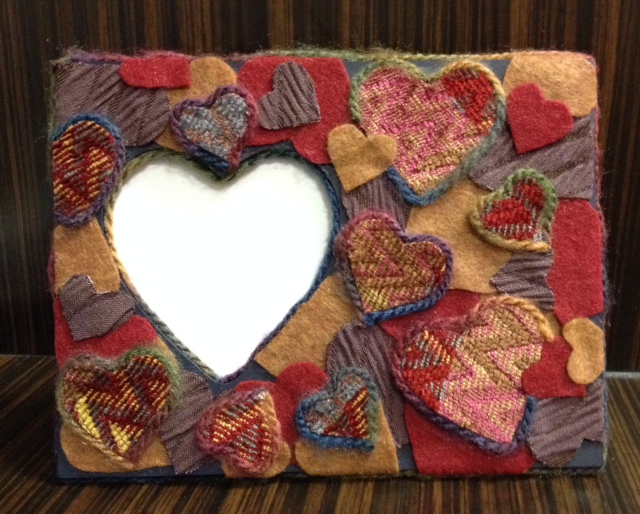 I used the yarn to finish off the interior of the heart and outline the outer edge of the frame. I think it looks a lot more expensive than its humble beginnings.