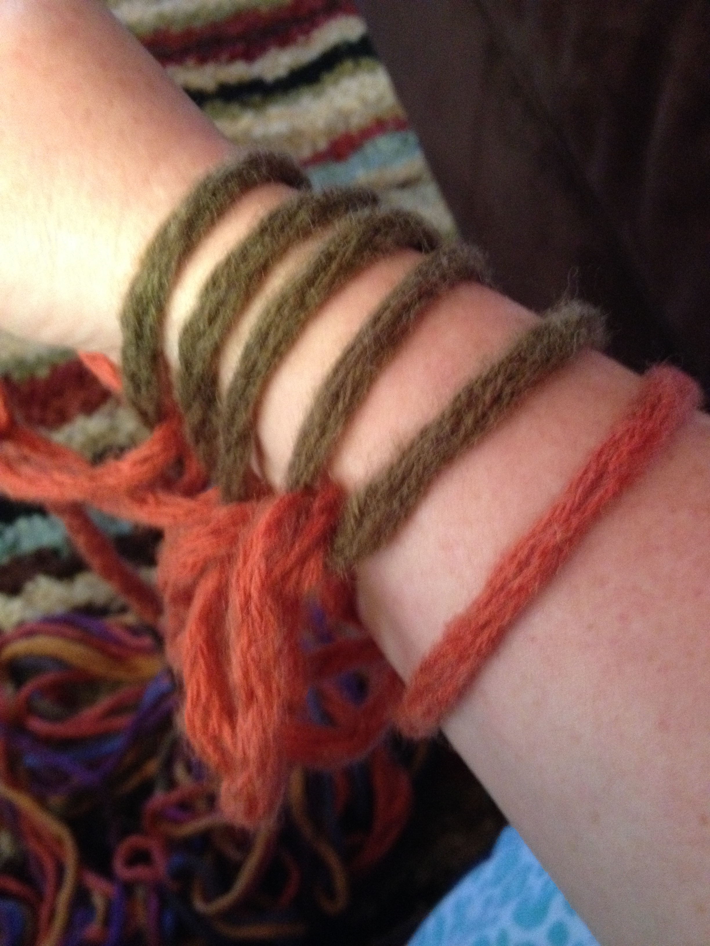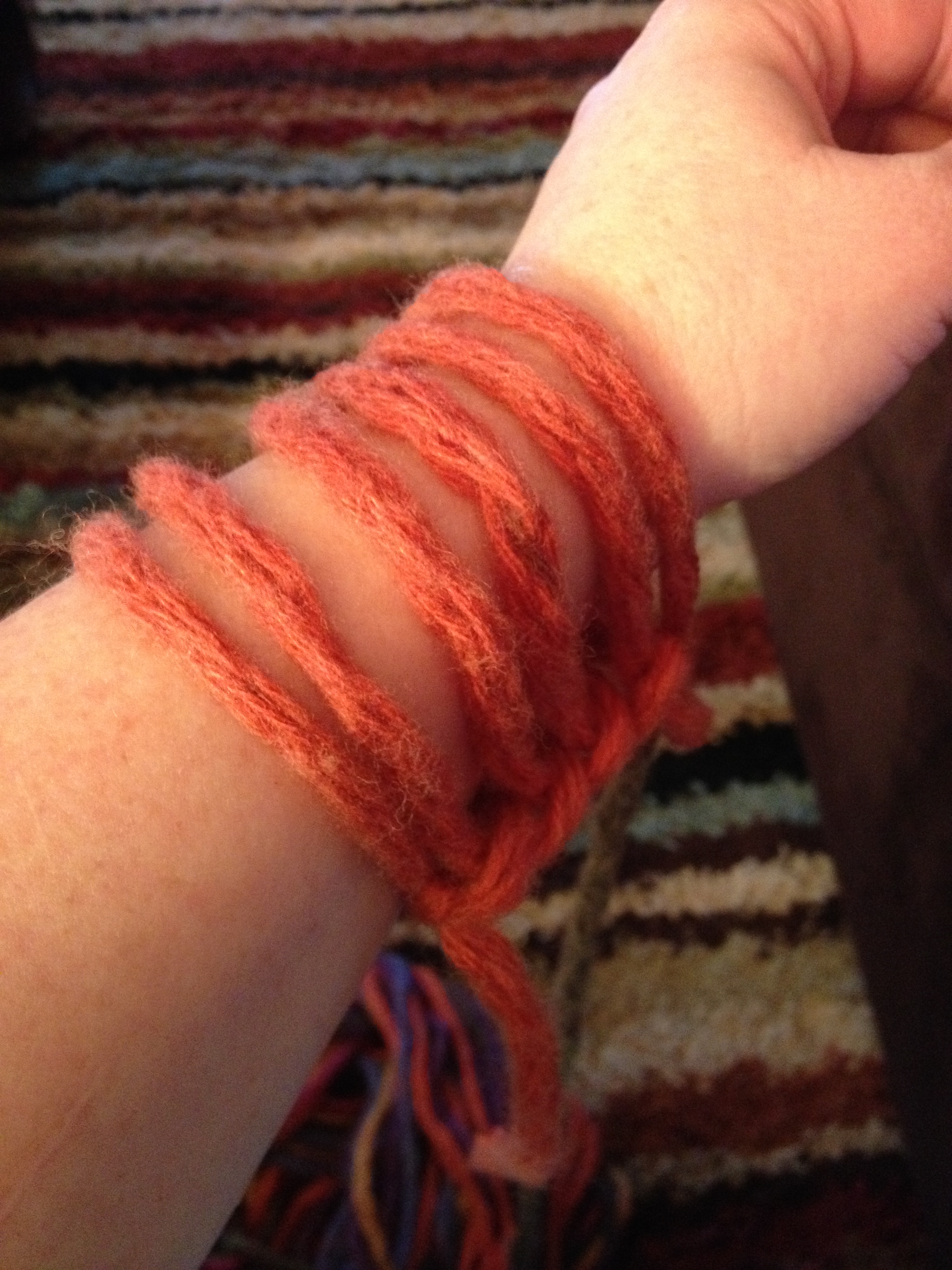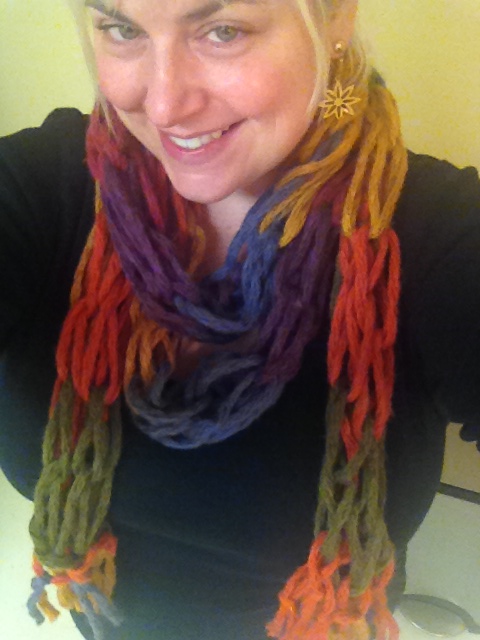 I have never been fond of knitting. I am self-taught under duress. When I was a senior at Drexel University, I decided to design sweaters and a knit skirt for my senior collection. I was able to use a knitting machine for the sweaters (which I loved!), but the yarn for the skirt was just to curly and loopy to work on a machine. So I bought a book and spent many hours knitting and unraveling and knitting again. I finished the skirt, but decided that knitting was not for me. That was until I discovered this on Pinterest. It is called arm knitting and you use chunky yarn. I made a scarf and actually had fun doing it. The total project took 20 minutes. Fun and fast? That is a win!