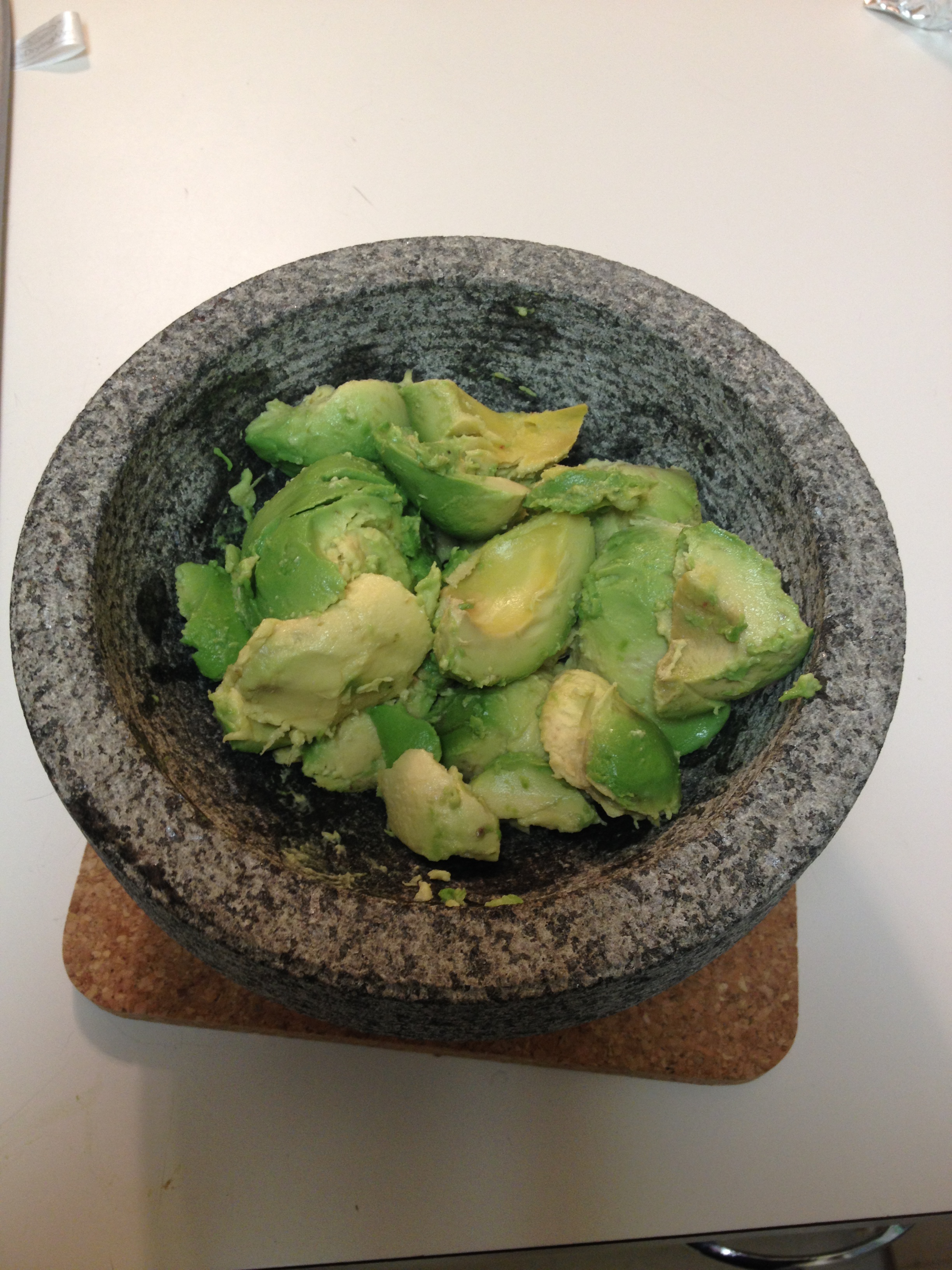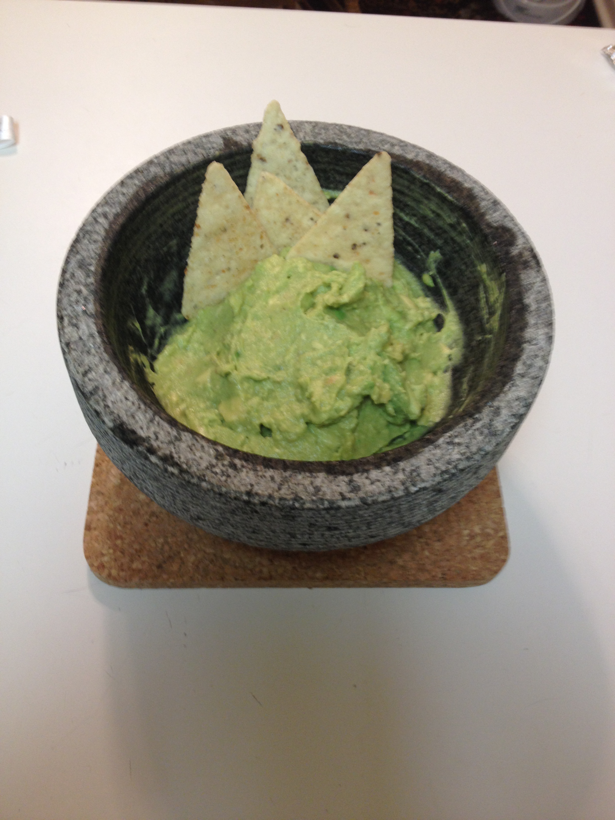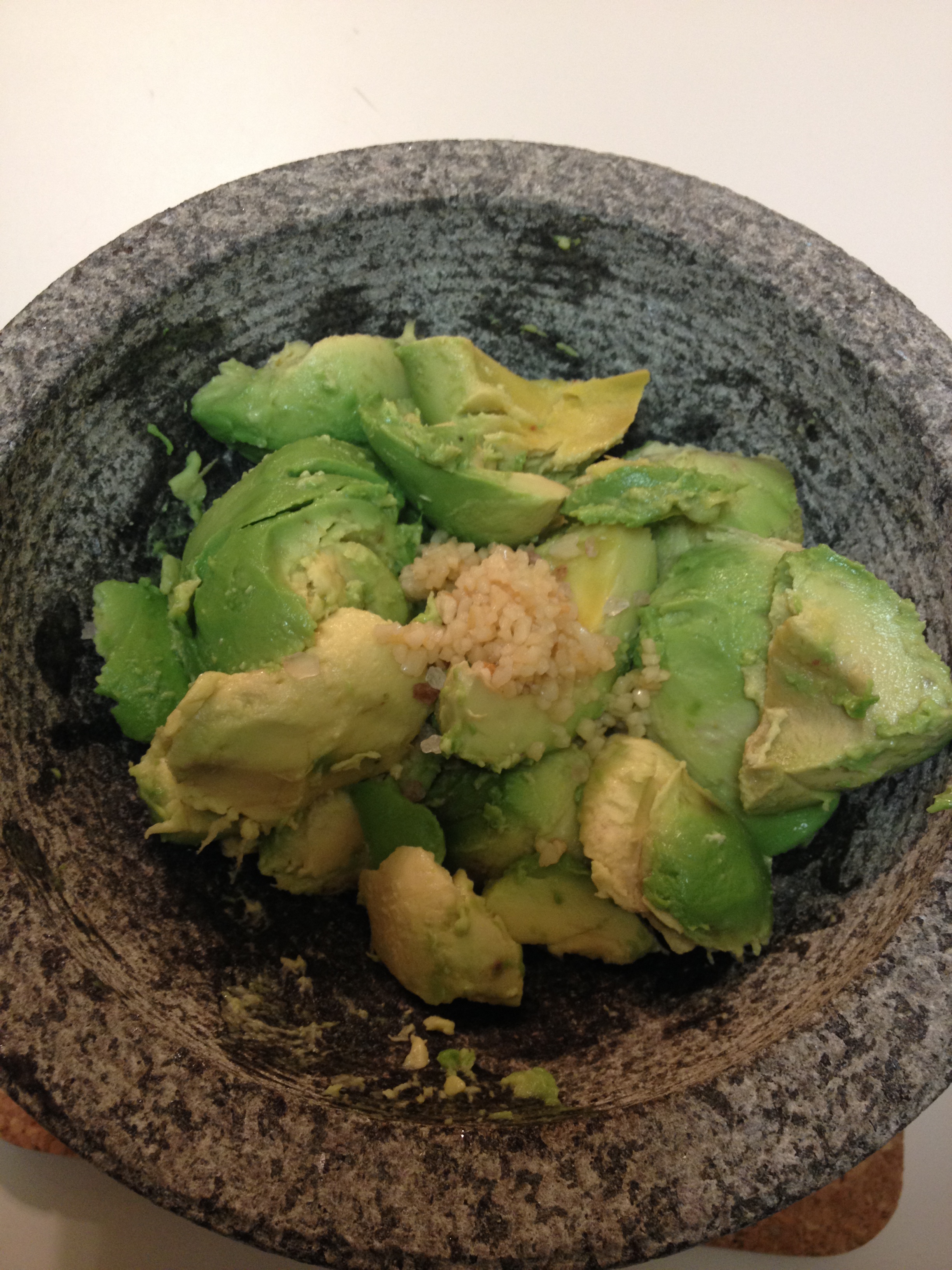 My friend, Laura, sent me a house warming gift of a granite molcajete. Last year, she visited me and we went to a restaurant called Oba! where they make table side guacamole using a molcajete. It was fun to watch as the waiter threw in lots of delicious ingredients and ground them into a creamy, delicious guacamole for us to devour. I thought I’d try my hand at making my guacamole in my very own molcajete. I like to keep my guacamole simple so I can savor the rich taste of avocado. Three simple ingredients: avocados, garlic, salt. Add the chips and enjoy!