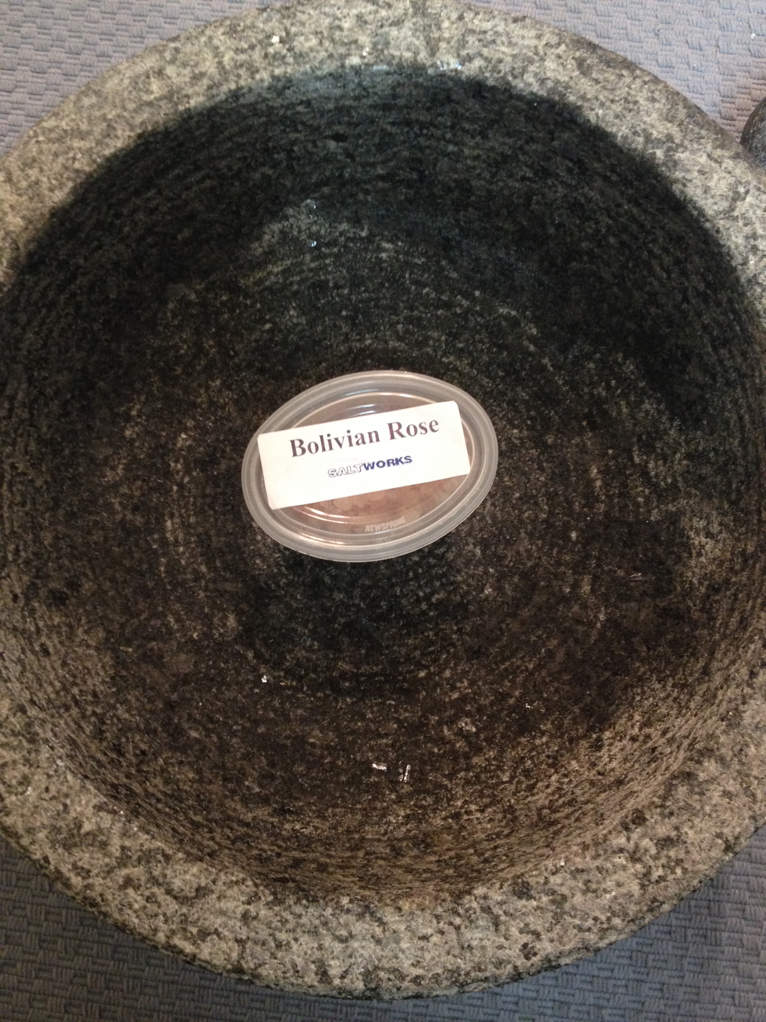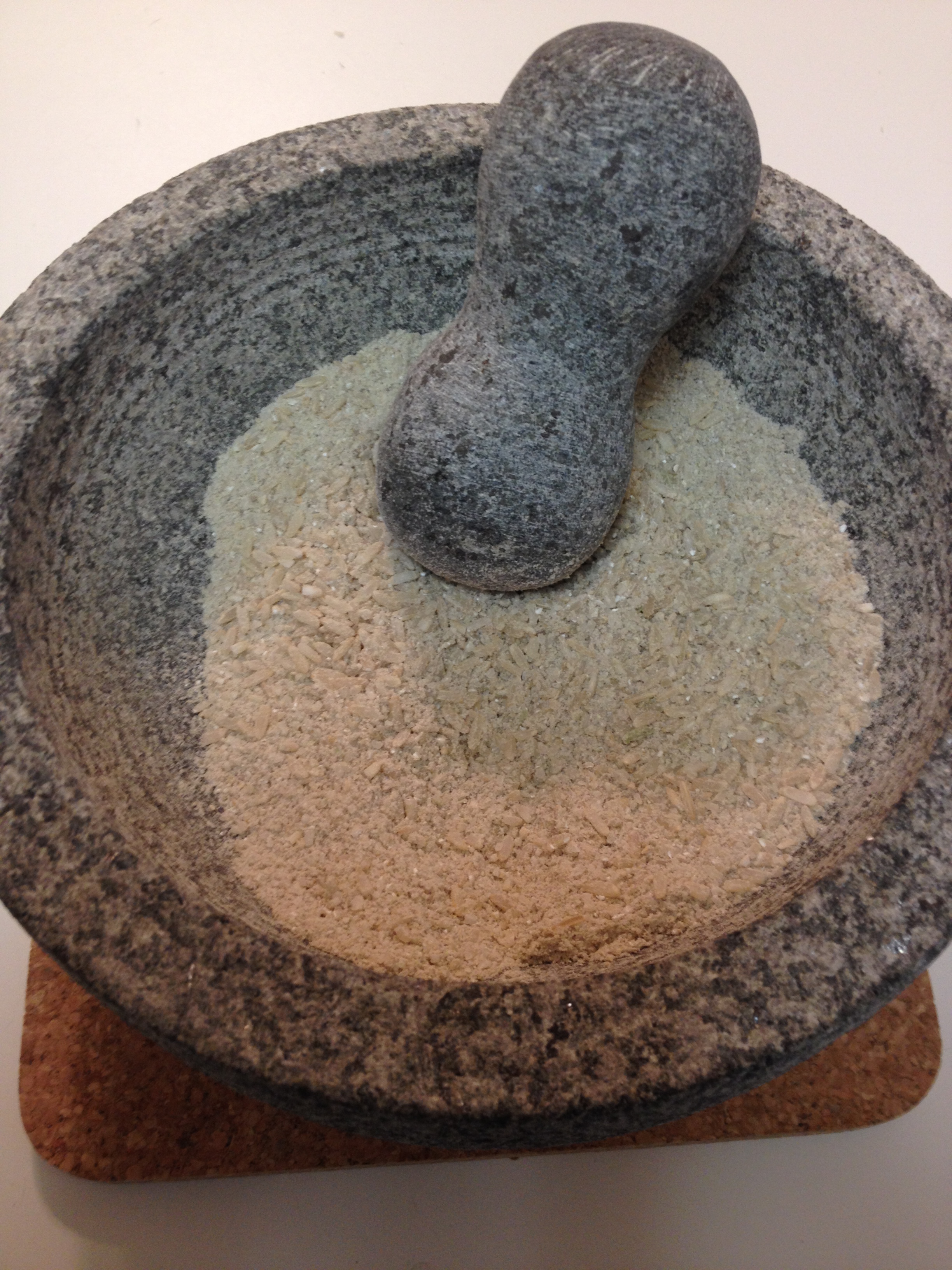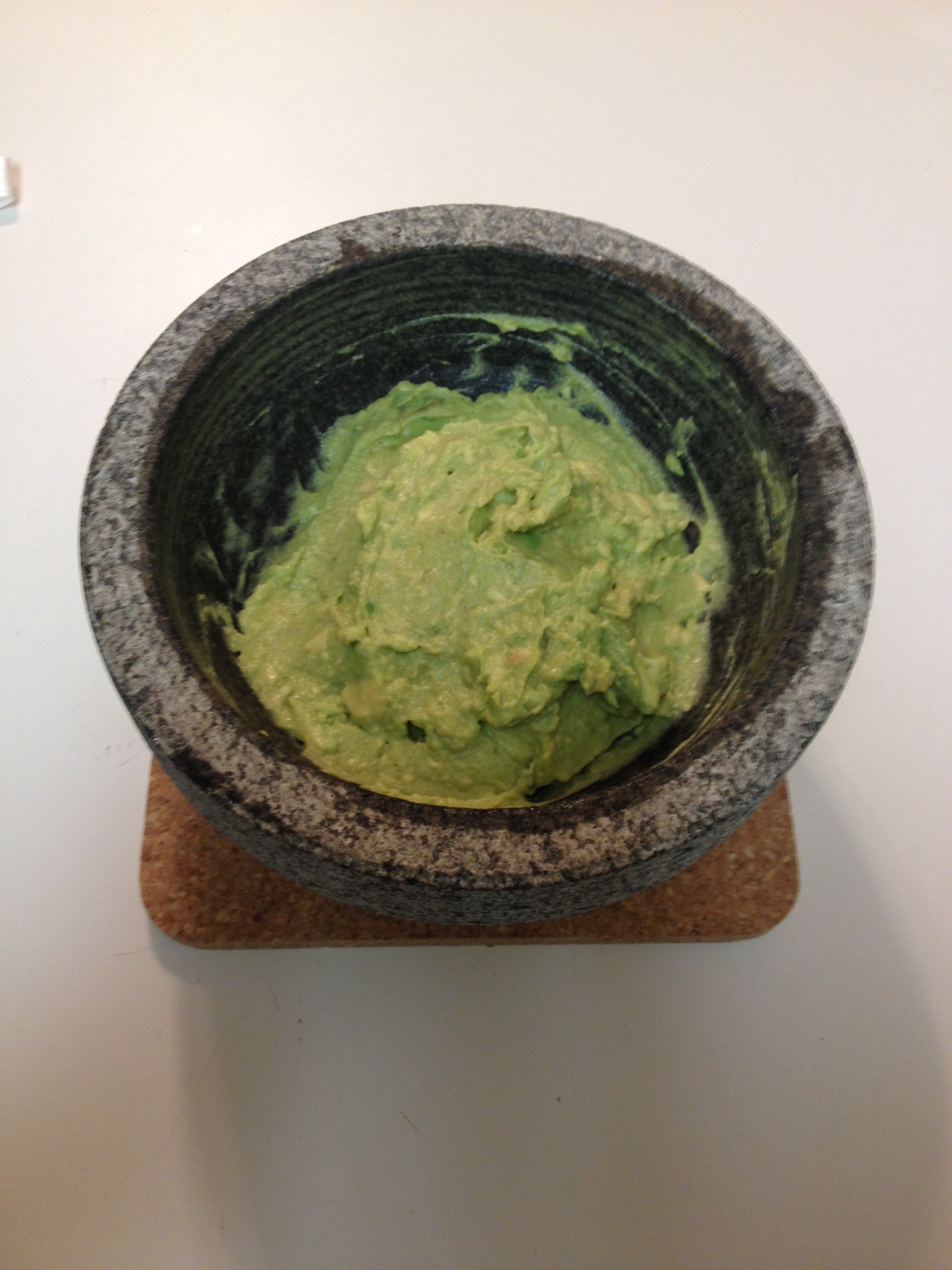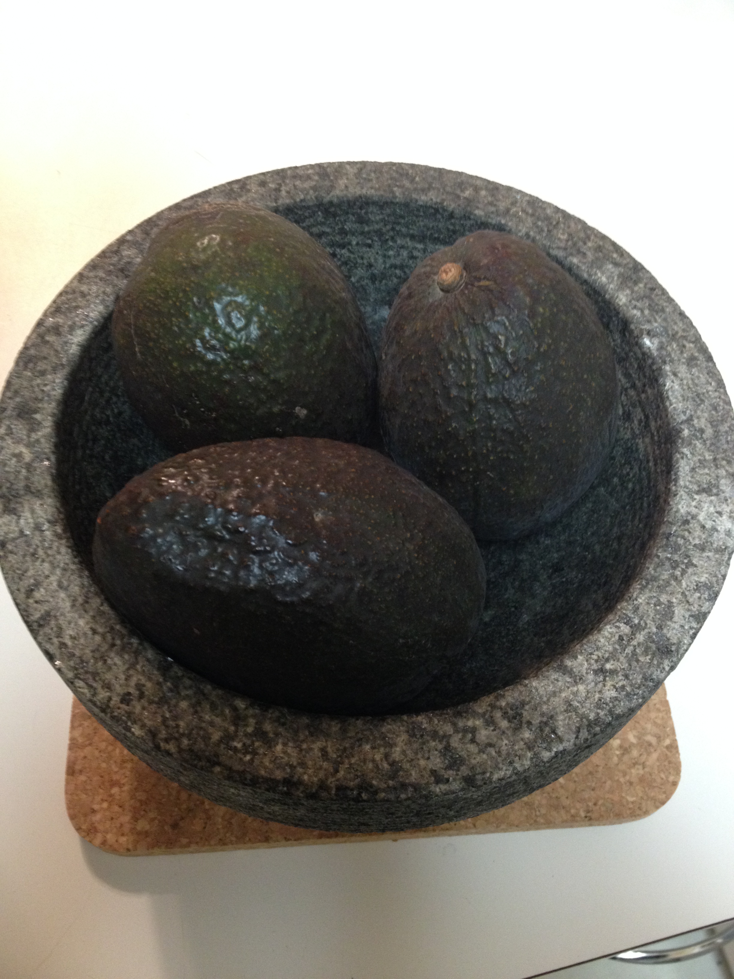 My friend, Laura, sent me a house warming gift of a granite molcajete. Last year, she visited me and we went to a restaurant called Oba! where they make table side guacamole using a molcajete. It was fun to watch as the waiter threw in lots of delicious ingredients and ground them into a creamy, delicious guacamole for us to devour. I thought I’d try my hand at making my guacamole in my very own molcajete. I like to keep my guacamole simple so I can savor the rich taste of avocado. Three simple ingredients: avocados, garlic, salt. Add the chips and enjoy!