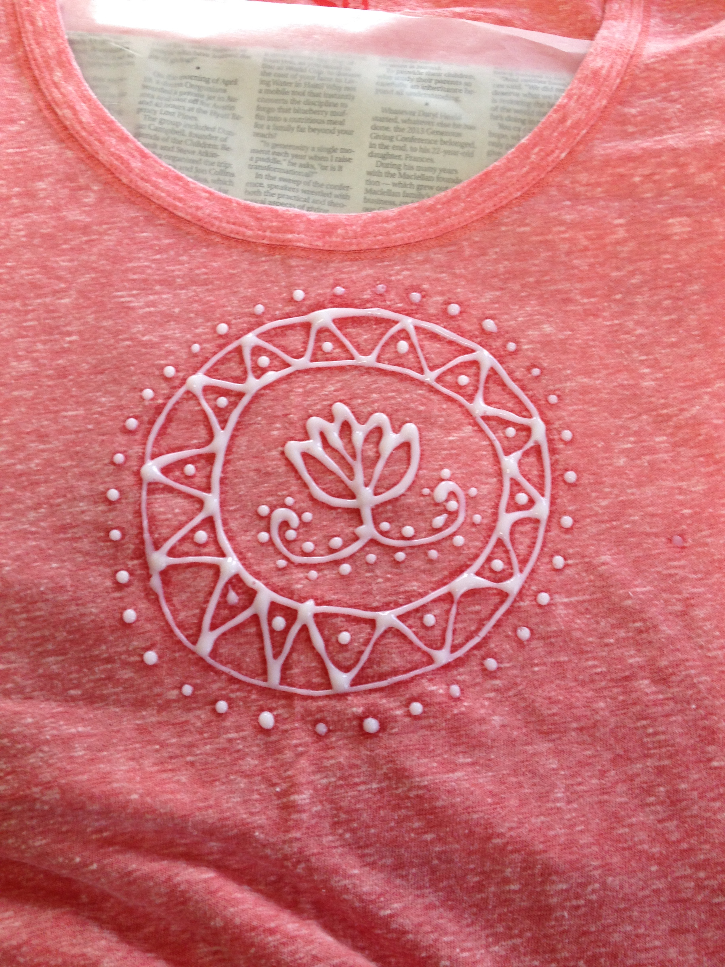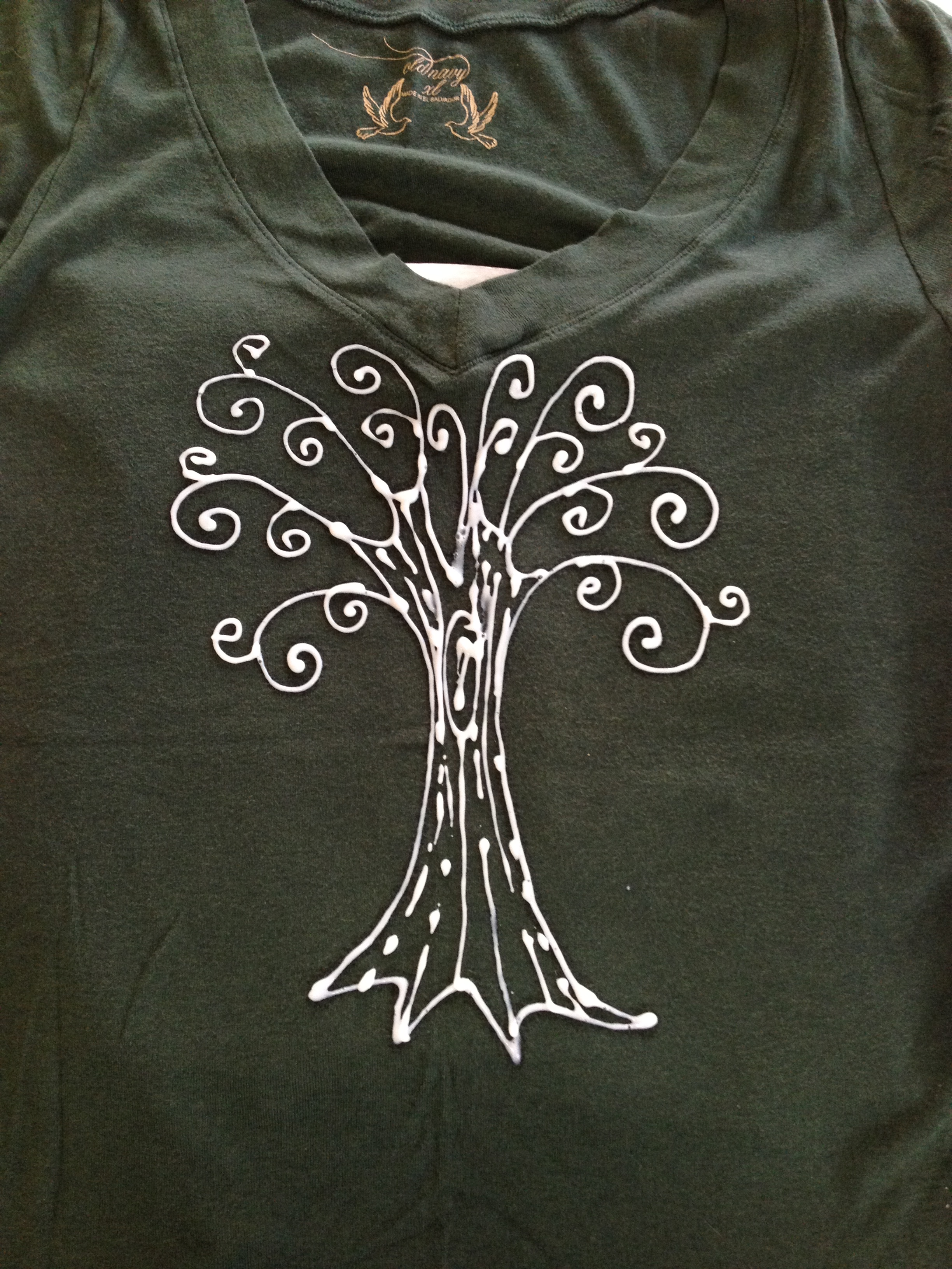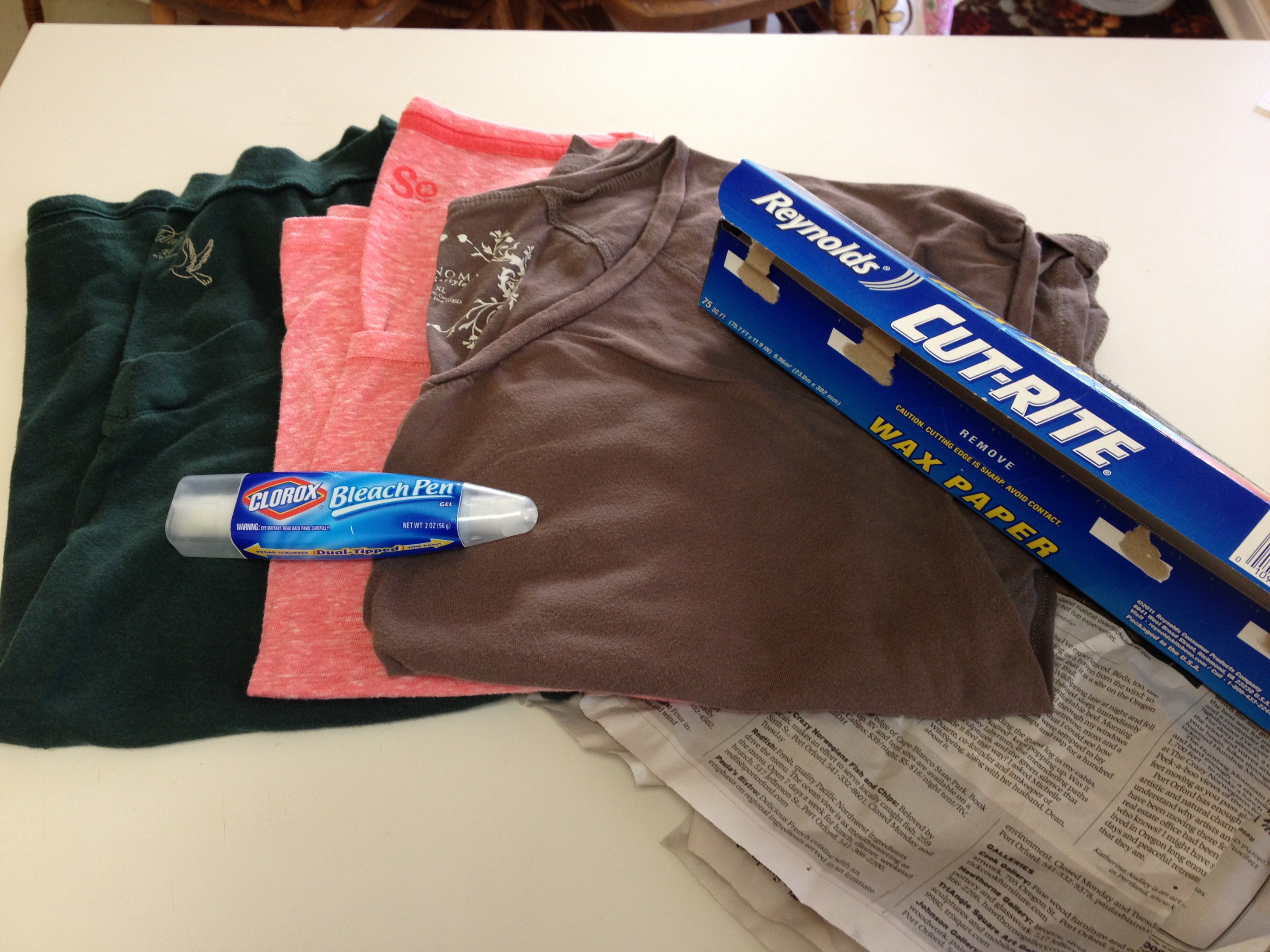 As I was perusing Pinterest last week, I came across a project to revive old t-shirts (or at least give them a new lease on life and maybe wear them again!). The premise was simple – use a Clorox Bleach Pen to draw graphics on the t-shirts, rinse off and wash/dry. I found 3 t-shirts that I almost never wear and rolled up my sleeves to get to work. I decided to draw them freehand after making some doodles in my sketchbook. I was really happy with the two bolder looks and let them sit to supposedly bleach away. When I checked on the progress 15 minutes later, I was sad to see that there was no change in color. So I let them sit another 15 minutes. After more than 30 minutes, the bleach still wasn’t working. I thought perhaps the content of the t-shirts may have something to do with it. Two of them were mostly cotton with a touch of polyester, but one was 100% cotton and should be affected by bleach. I decided to rinse them off and chalk this up to a lesson. But I’m still trying to figure out the lesson….t-shirt content? Bleach strength? Color of dye? This will require a trip to the store to look at the different bleach pens to see if there is one specifically for whites (and therefore a higher concentration). To be continued……..