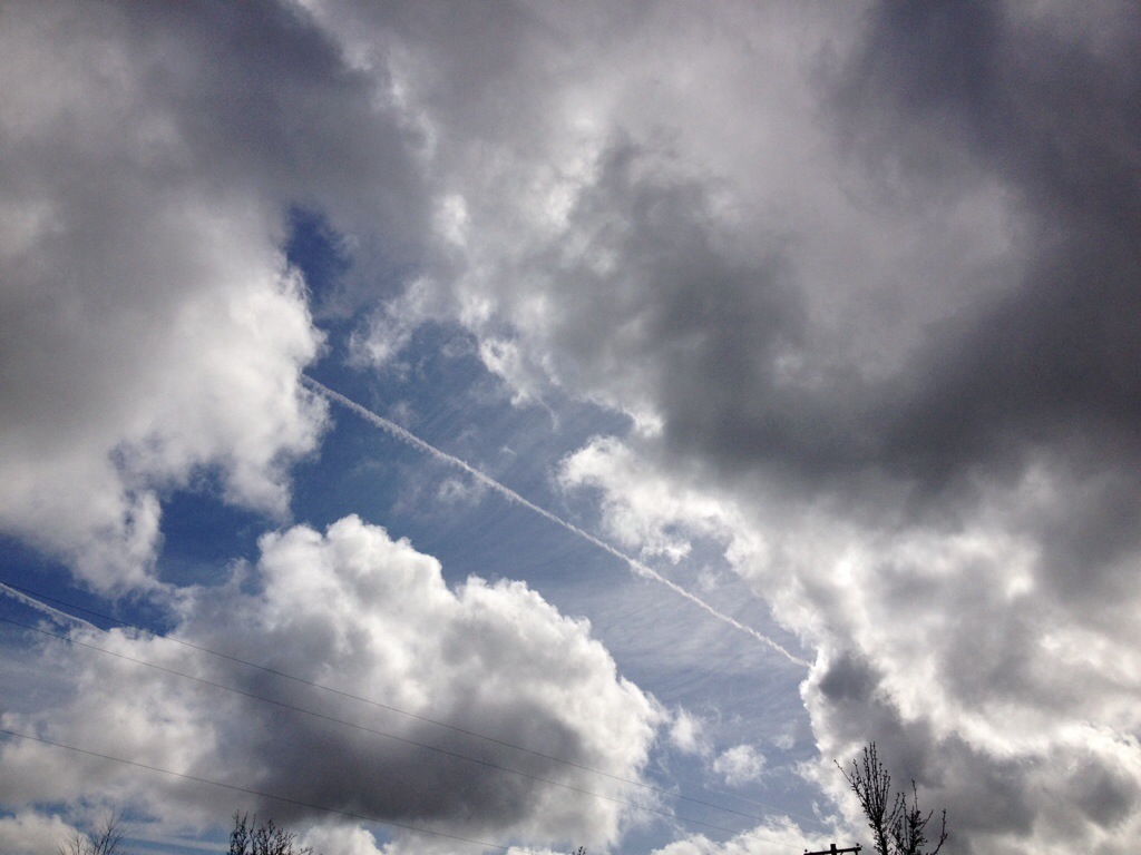 I looked up to see the wondrous swirling clouds that are somewhere between rain and sun. In the bright blue opening I saw two man made lines in stark contrast to the fluffy nature of the clouds.